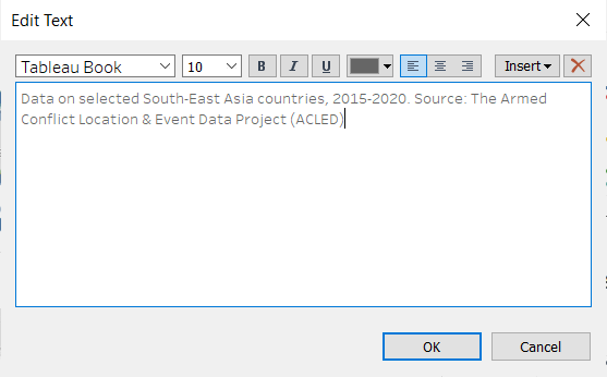 - Double click on the sheet title. In the popup “Edit Title” dialog box, amend the sheet title to “Armed Conflict Events in ” and click OK