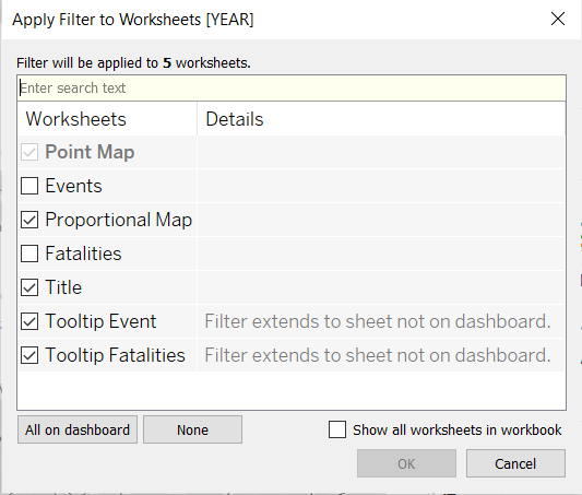 - Click on the [Year] filter and click the dropdown arrow on the left. Select Apply to Worksheets > Selected Worksheets. In the popup “Apply Filter to Worksheets” dialog box, check only Proportional Map, Title, Tooltip Event and Tooltip Fatalities. Click OK