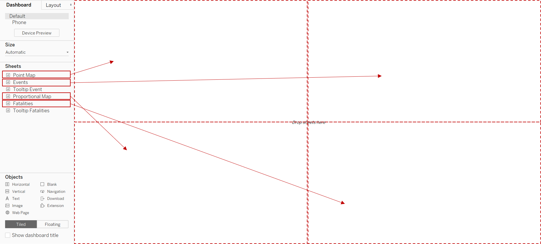 - From the left Dashboard pane, drag [Point Map] under Sheets onto the dashboard canvas then drag [Events] to the right of the [Point Map]. Drag [Proportional Map] and [Fatalities] to below [Point Map] and [Events] on the canvas