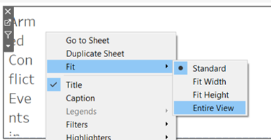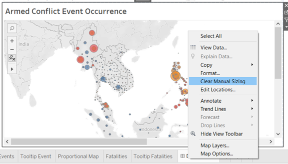 - Right click within the chart area of “Armed Conflict Event Occurrence” chart and select Clear Manual Sizing to resize the map and remove the scrollbar