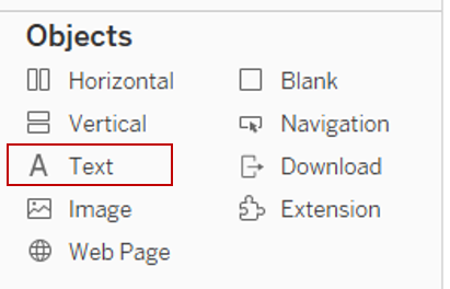 - From the left Dashboard pane, drag Text under Objects to the top of the dashboard