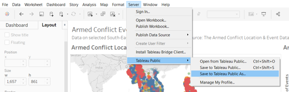 - On the top navigation pane, click Server > Tableau Public > Save to Tableau Public As