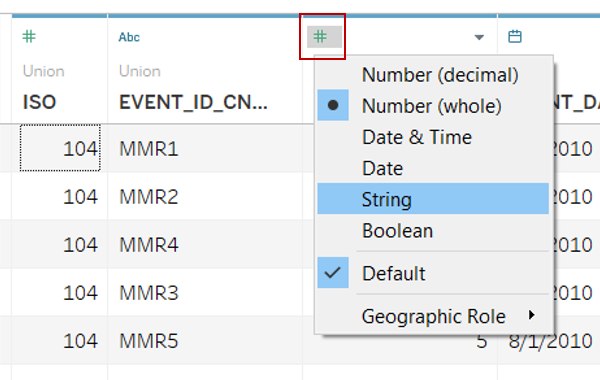 - Click on the symbol at the top left of the header of field [EVENT_ID_NO _CNTY] and convert the data type of from Number (whole) to String