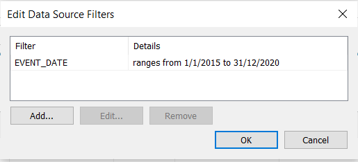 - In the popup “Edit Data Source Filters”dialog box, click Add to open an Add Filter dialog box listing all fields in the data source. Search for [EVENT_DATE] and select the field > specify Range of Dates in the popup “Filter Field” dialog box > Indicate 1/1/2015 as the start date and keep 31/12/2020 as the end date. Click OK