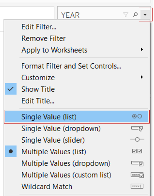 - Click on the dropdown button at the top right of the YEAR Filter. Select Single Value (list)