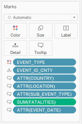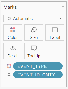 - Drag [EVENT_ID_CNTY] and [EVENT_TYPE] from the left Data pane to Detail and Color under the Marks cart respectively