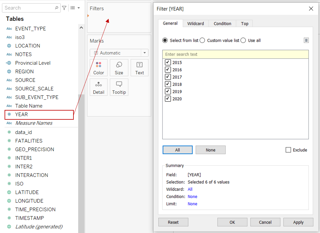 - Drag [YEAR] from left data pane to the Filters shelf. In the popup “Filter” dialog box, click on All and click OK