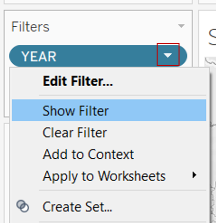 - Toggle to [YEAR] under Filter shelf and click on the dropdown button to the right of the pill. Select Show Filter