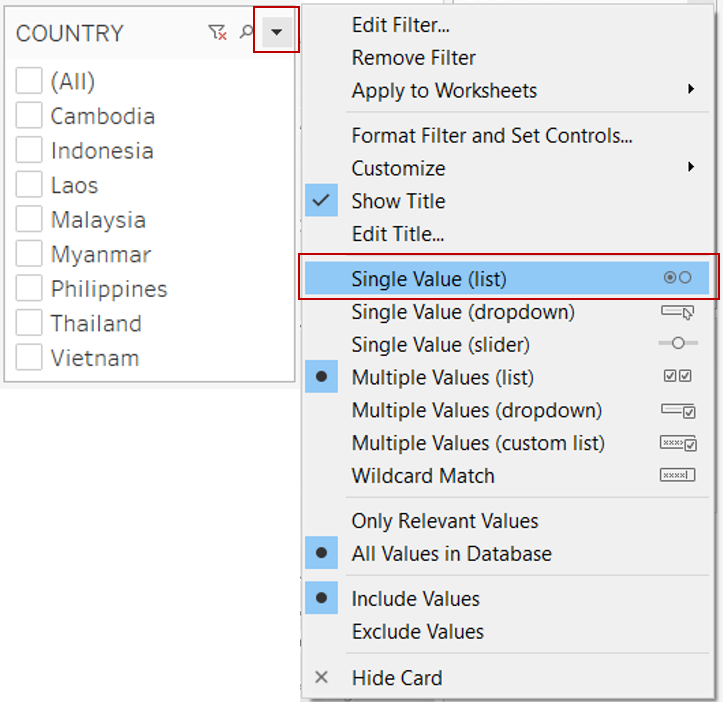 - Toggle to [COUNTRY] under Filter shelf and click on the dropdown button to the right of the pill. Select Show Filter