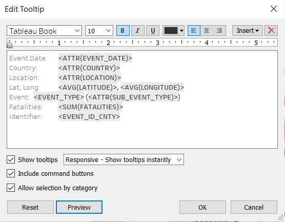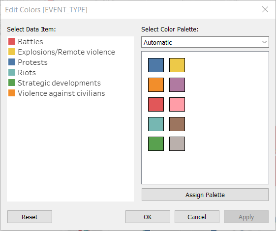 Each of the data symbol on the map chart is currently showing the spatial information of “Event Id Cnty”, “Latitude” and “Longitude” only in the tooltip. While the map allows readers to identify the country that the event has occurred, readers are not able to easily identify the specific location of the event from the latitude and longitude coordinates. “Event Id Cnty” might also confused readers who are not familiar with the dataset. |