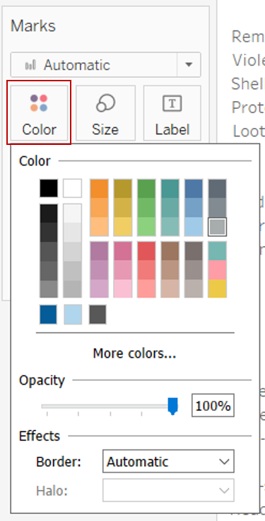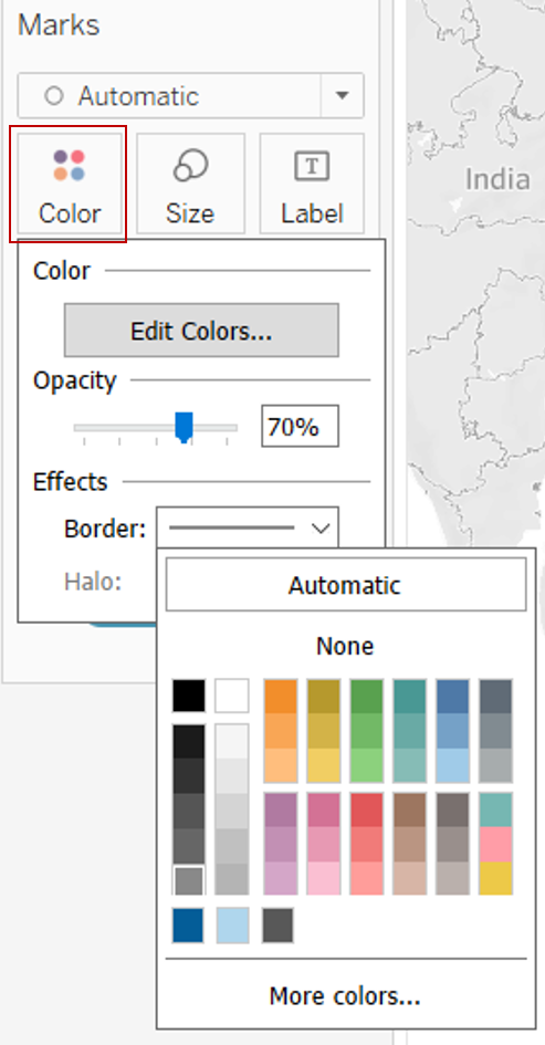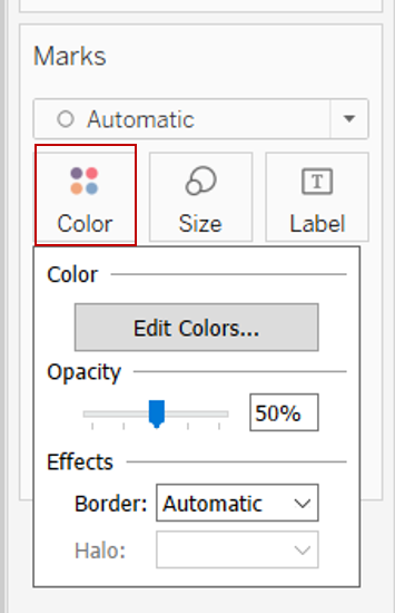 - Click on Color under the Marks cart. Change the Opacity to 70% and click the dropdown button under Border to add a light grey border