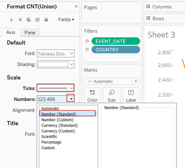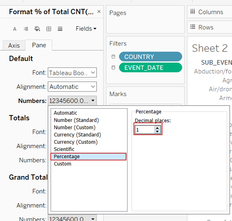 - Toggle to the [CNT(Union)] with Table Calculation under Marks cart and click on the dropdown button to the right of the pill. Select Format. Under Pane tab, change the Numbers under Default section to Percentage with 1 decimal place