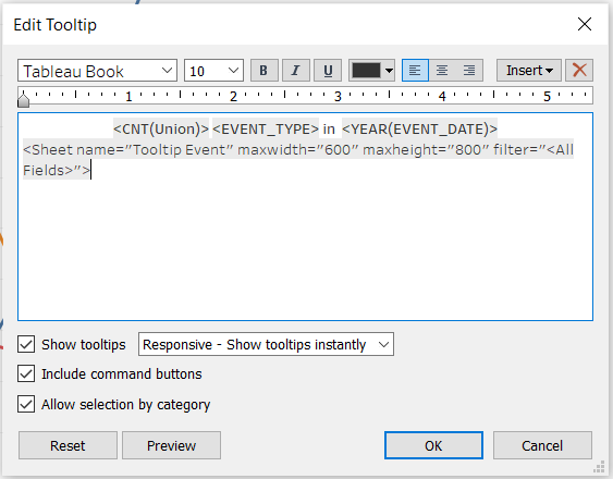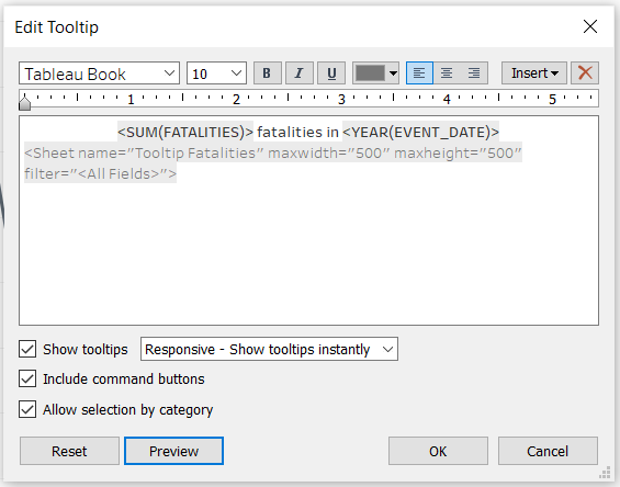 - Click on Tooltip under the Marks cart. Edit the tooltip according to preference. Add the Tooltip chart by clicking on the Insert > Sheets > Tooltip. Amend the dimensions of the chart in the given syntax. Below is the syntax used for the current tooltip shown
