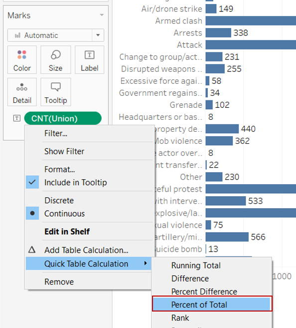 - Toggle to [CNT(Union)] under Marks cart and click on the dropdown button to the right of the pill. Select Quick Table Calculation > Percent of Total to create the percentage label