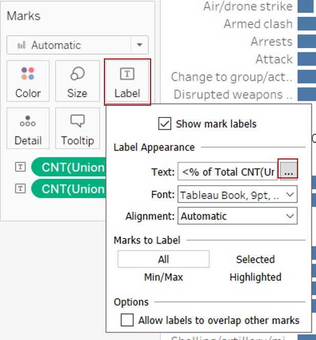 - Click on Label under the Marks cart then the button with 3 dots under Text. Update the label to <% of Total CNT(Union)> (<CNT(Union)>) and reduce the font size to 8pt then click OK