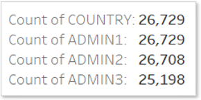 - Checking the number of counts for the different spatial variables showed that [ADMIN1] (corresponds to provincial level, or similar) is the lowest common mapping level available across all the data points