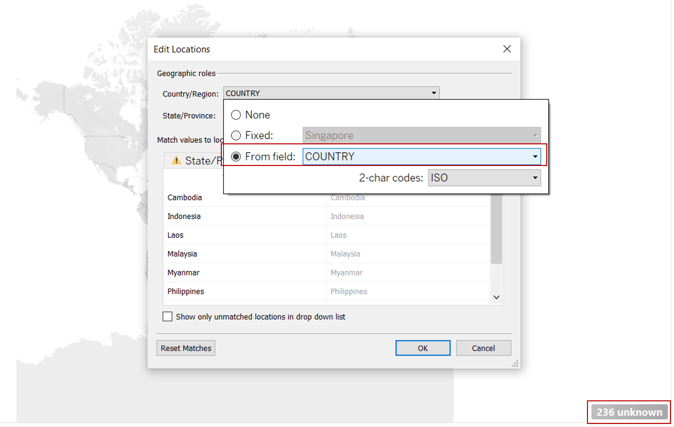 - From the left Data pane, drag [ADMIN1] into the chart canvas. Click on “236 unknown” message at the bottom right of the canvas. In the popup “Edit Locations” dialog box, click on the dropdown button for Country/Region and select From field > select COUNTRY