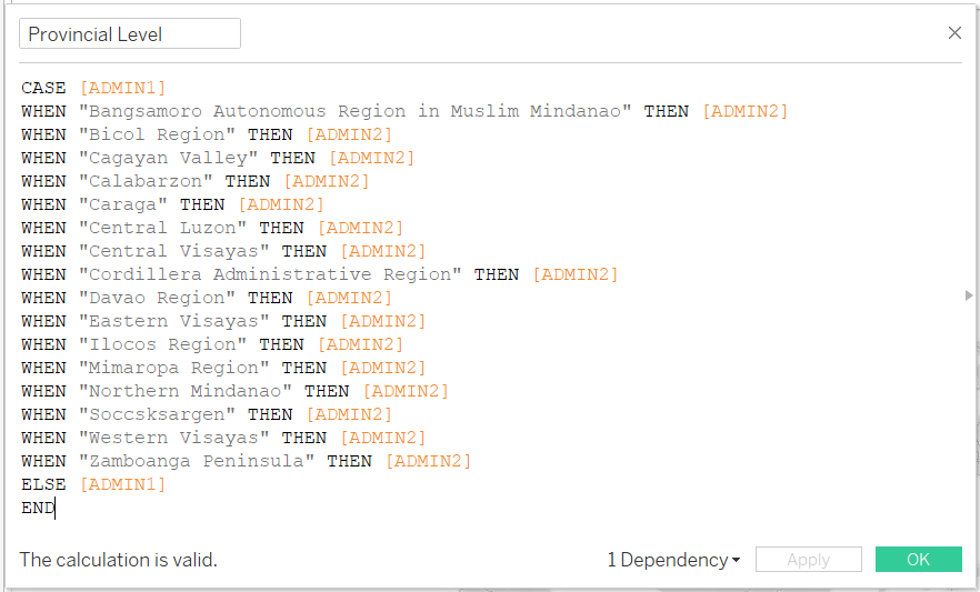 - To address the mapping issue identified, a new calculated field will be created. Click Analysis > Create Calculated Field. Rename the new field as [Provincial Level] and input the formula below then click OK