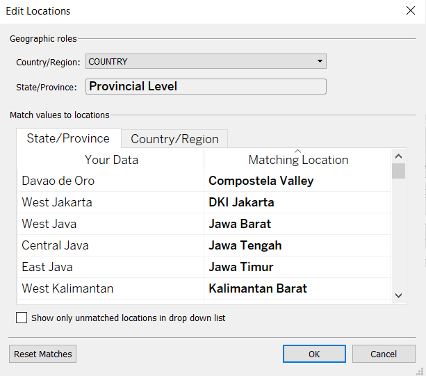 - Within the same “Edit Locations” dialog box, under the State/Province tab, select the respective province names from the list under Matching Location for the remaining unknowns which is due to difference in naming