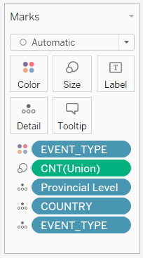 - From the left Data pane, drag [Union (Count)] and [EVENT_TYPE] to Size and Detail under the Marks cart respectively. Drag another [EVENT_TYPE] to Color