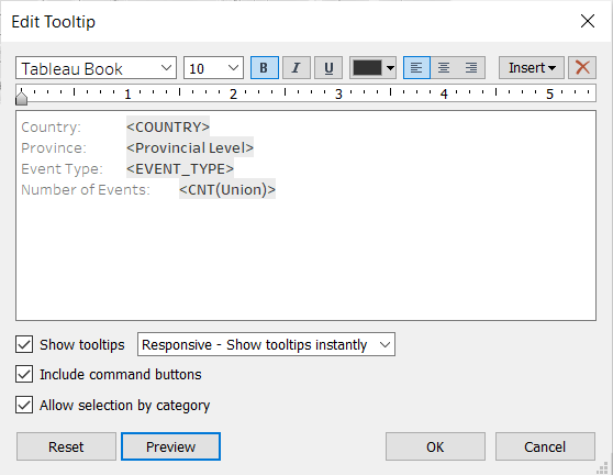 Include the province or district label (depending on the level of mapping used) in tooltip and replace “Event Id Cnty” with the country name instead |