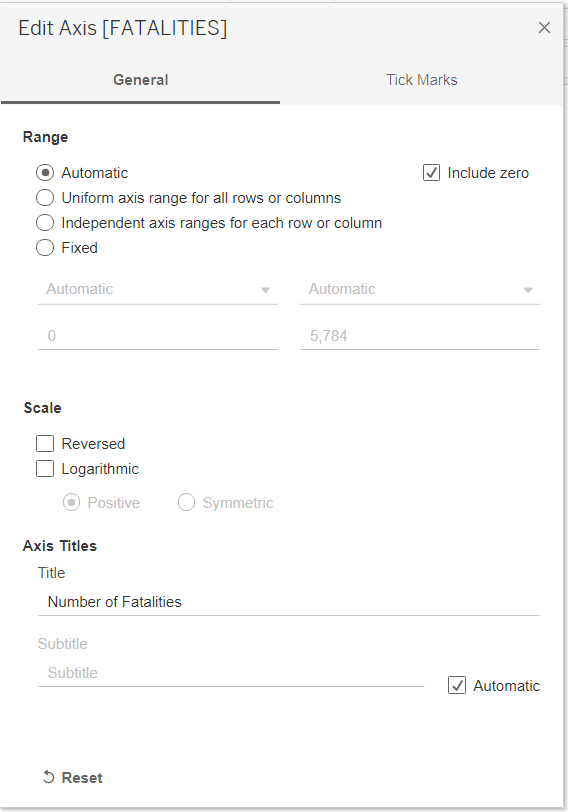 - Right click on the y-axis and select Edit Axis. In the popup “Edit Axis” dialog box, change the Title under Axis Titles to “Number of Fatalities”. Close the dialog box