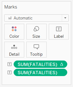 - Drag another [FATALITIES] from the left Data pane to Label under the Marks cart. This is meant for the count label