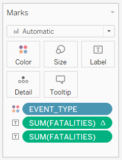 - Drag [FATALITIES] from the left Data pane to Label under the Marks cart