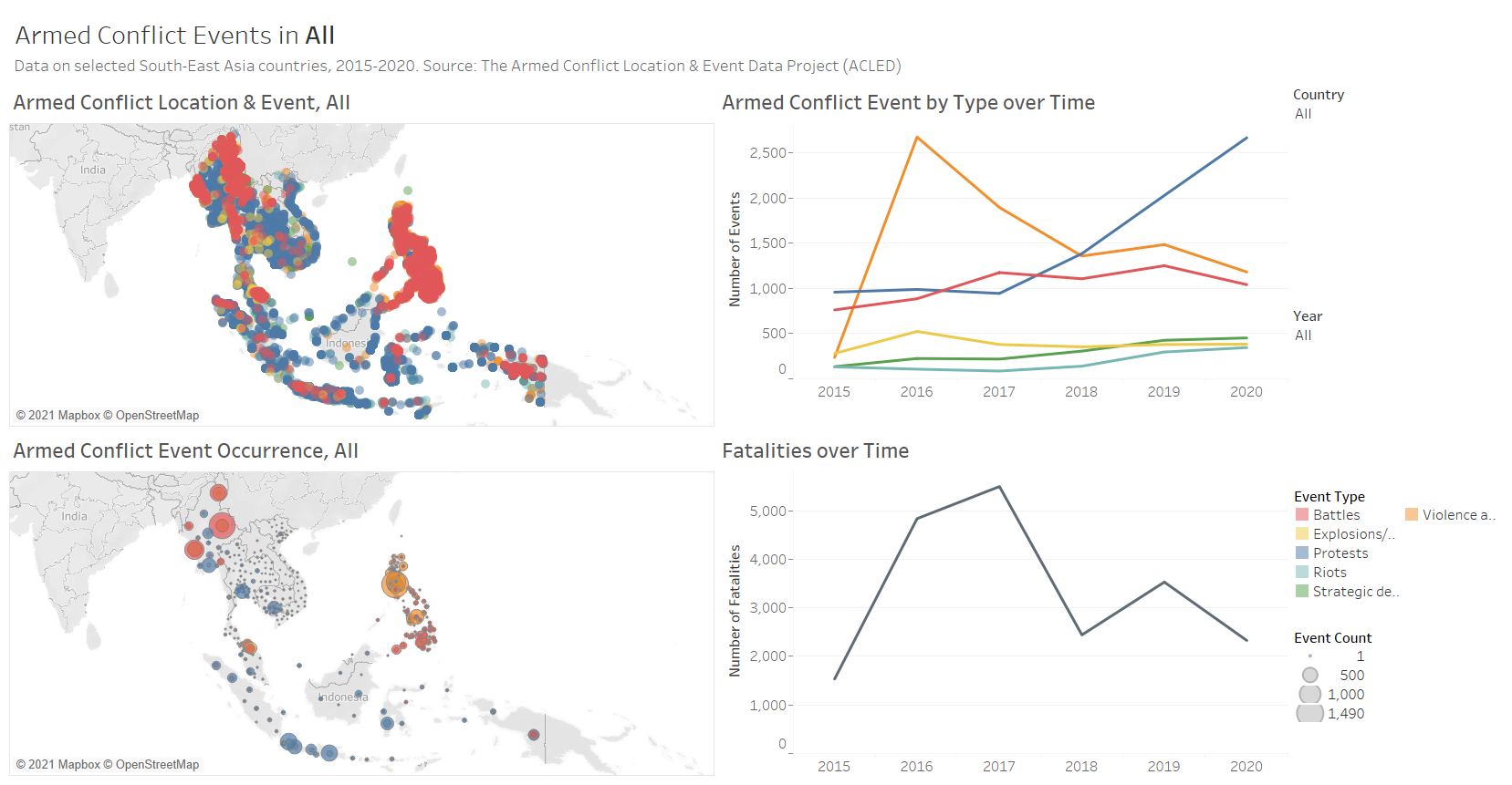 Data used for this visualisation can be downloaded from The Armed Conflict Location & Event Data Project (ACLED), focusing only on the South-east Asia dataset. While some of the South-east Asia countries have data starting from January 2010, only data from January 2015 onwards will be used. Data is also available till date of download but only data up till 31 December 2020 (the last complete year) will be used.