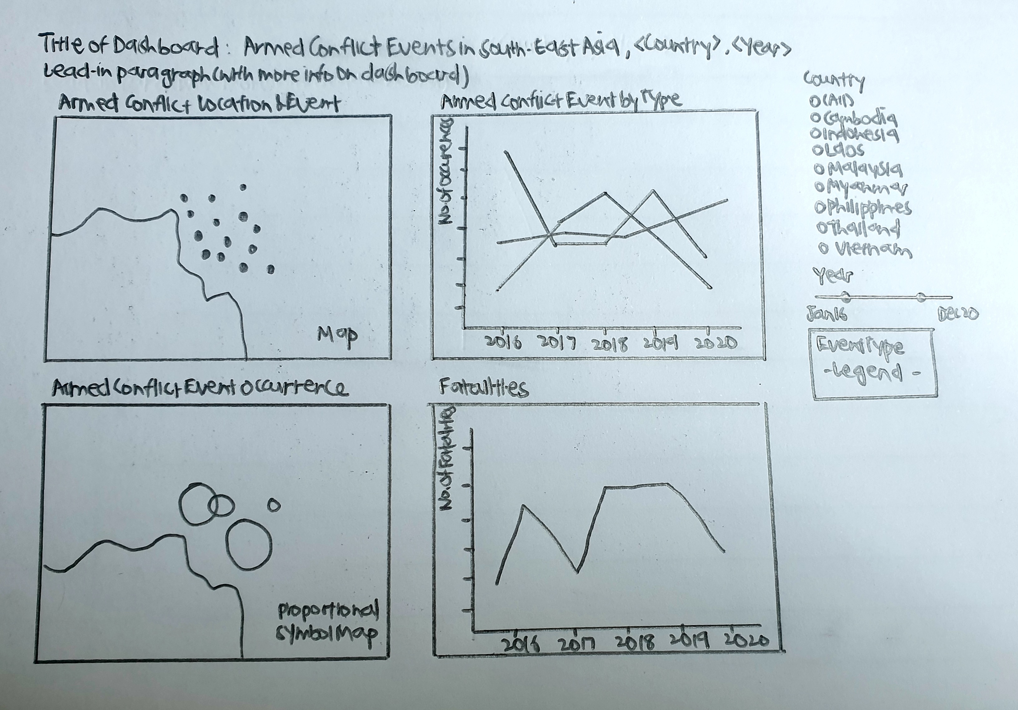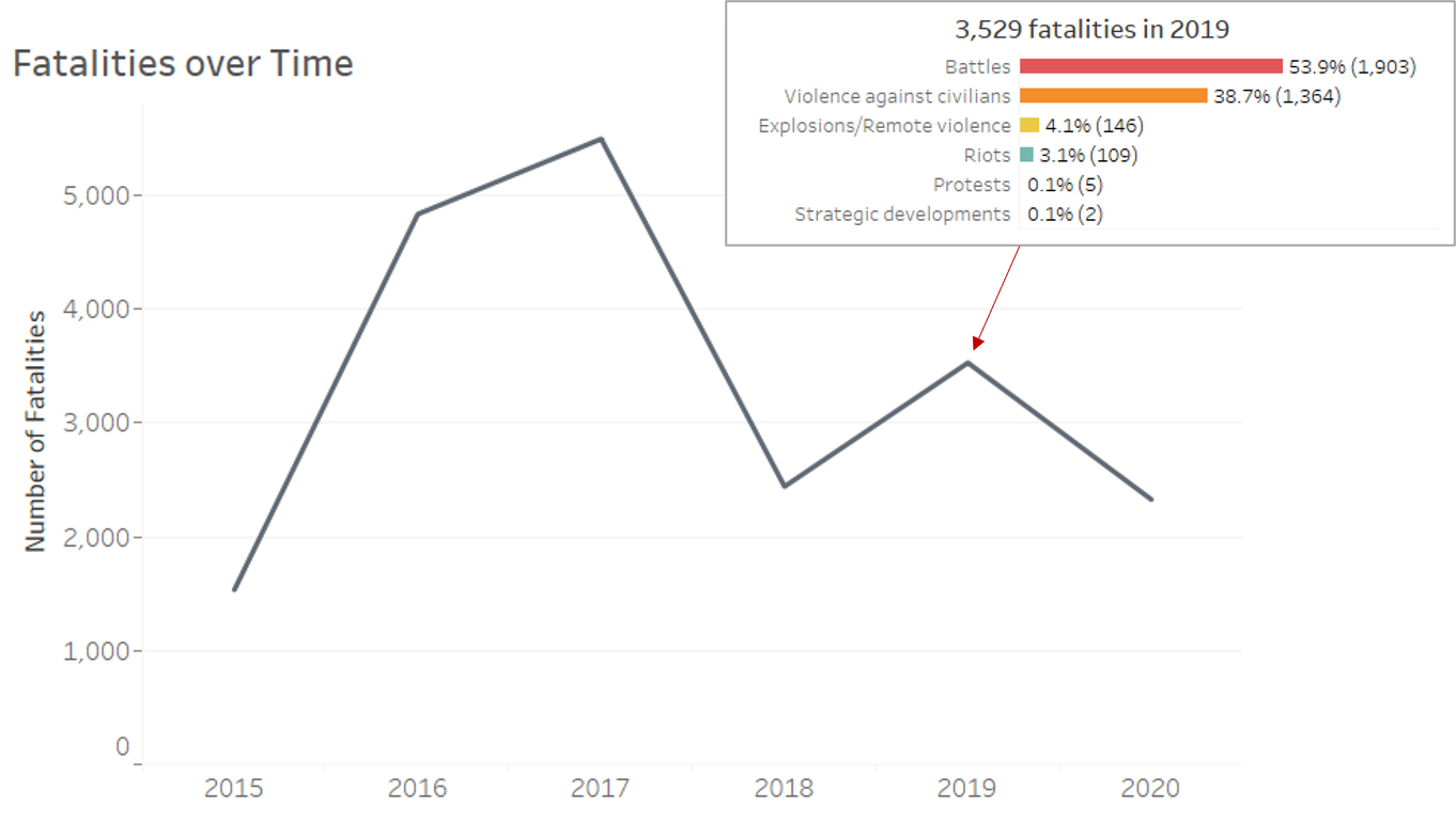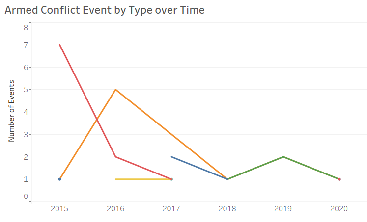 - Line charts are kept for depicting the occurrence of armed conflict events over time since line chart is one of the more appropriate chart types for time-series data. Likewise, map chart is kept for representing spatial data.