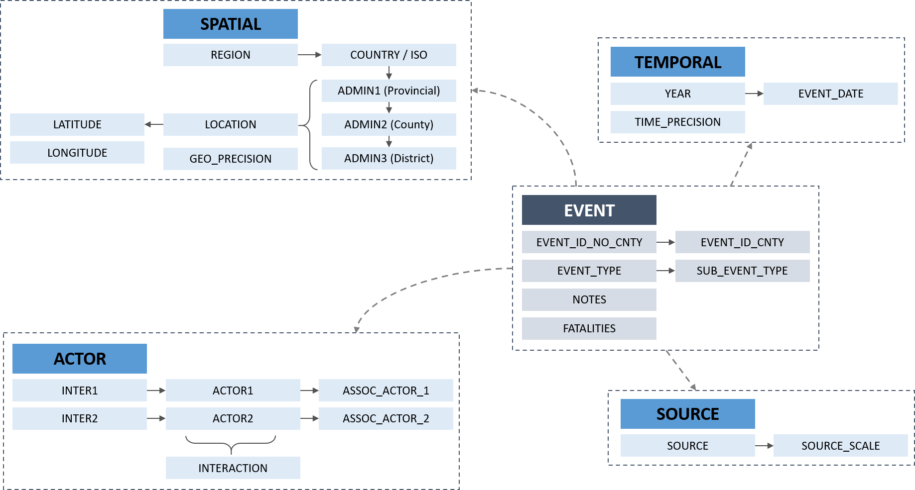 The dataset for South-east Asia has multiple fields, where each row represents a unique armed conflict event with multiple columns on different details of the event. The ACLED Codebook is reviewed and a data map is drawn out to show how the different variables are linked. Solid arrows in the data map represents a more granular level of data.