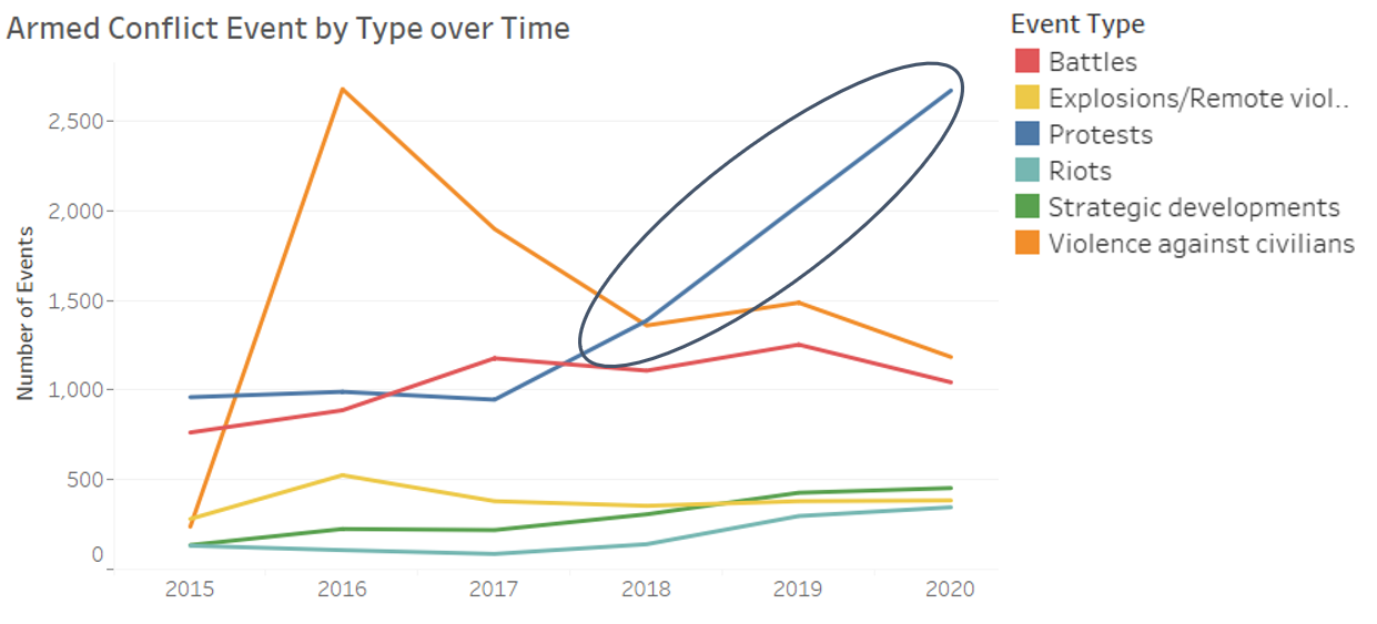 While there is a country filter to allow readers to select their country of interest, there is currently no parameter to allow filtering by year. For the map chart, all events from 2015 to 2020 are shown and readers cannot see the spatial patterns by years of interest |