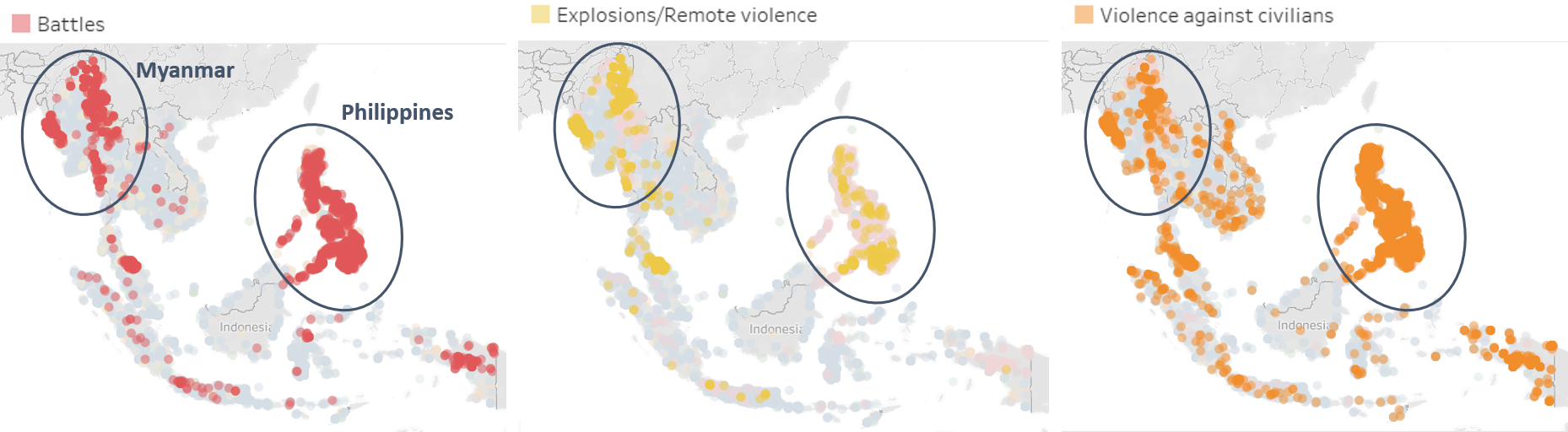 Myanmar and Philippines experienced the most cases of violence events (battles, explosions/ remote violence and violence against civilians) among the selected South-east Asia countries between the observed period.