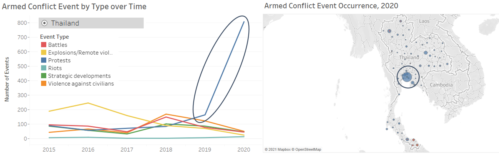 Thailand experienced a huge increase in the number of protests in 2020 as compared to 2019. Most of the protests occurred in the capital Bangkok, of which most of them were peaceful protests.