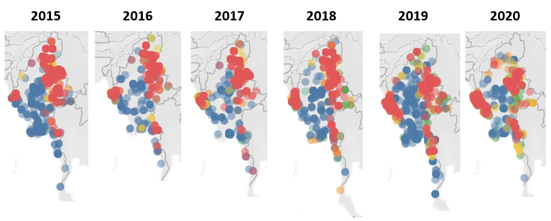 Comparing the spatio-temporal patterns of the armed conflicts in Myanmar between 2015 to 2020, we observed a shift in the locations of the events from North to South over the years.